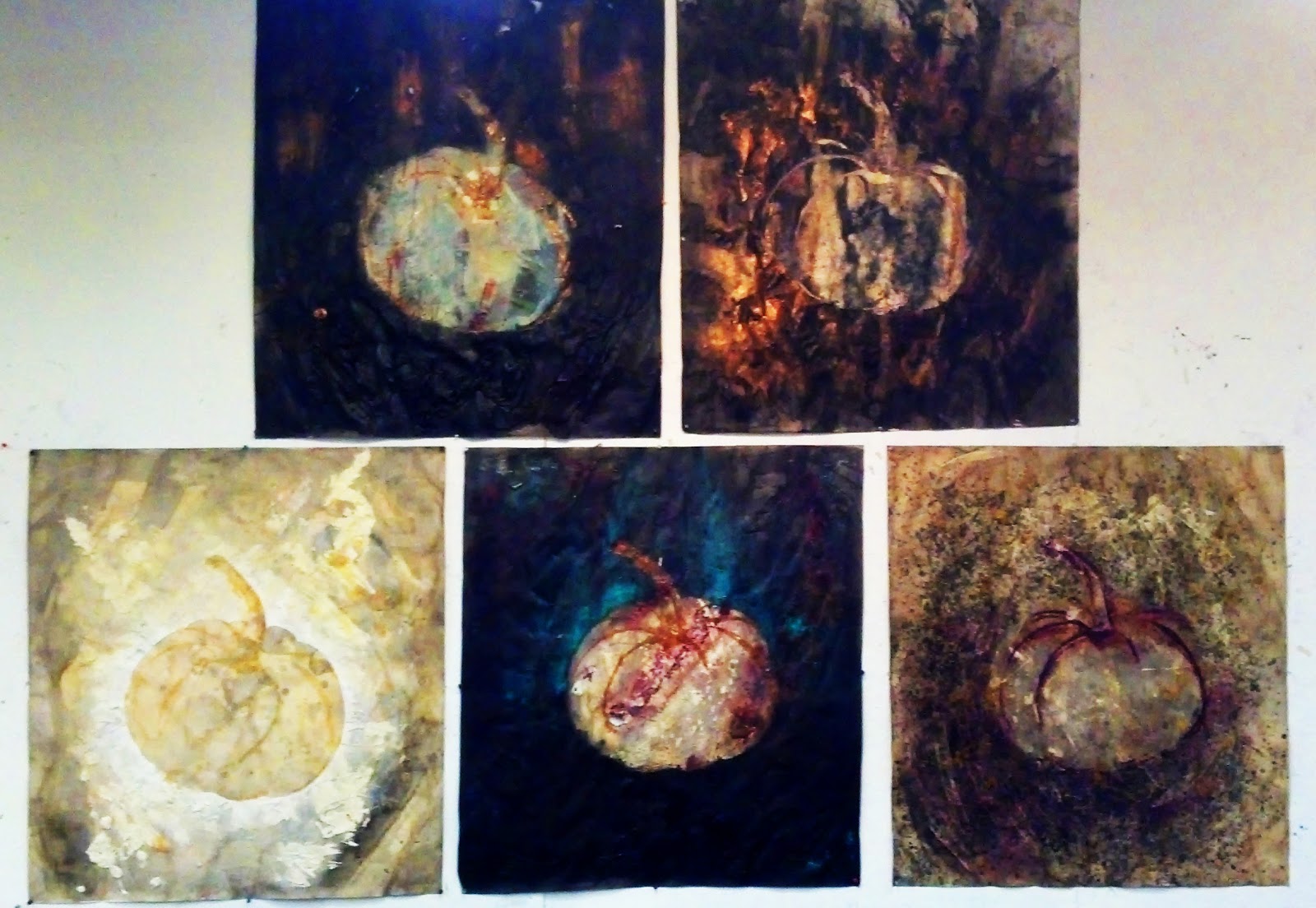 Carving the paper for sharp highlghts. The process of these pumpkins is sculptural, repeated yet varied. Stencilling proved to be very diverse and adept to producing a series of work.